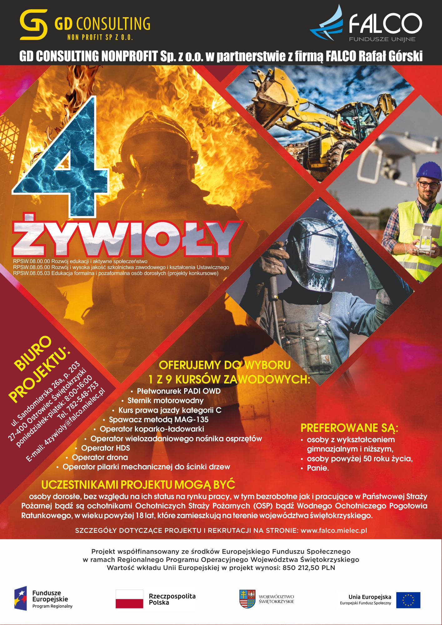 Uprzejmie informujemy, że firma GD Consulting NON PROFIT Sp. z o.o. zakończyła i rozliczyła realizację projektu „4 ŻYWIOŁY” współfinansowanego ze środków Regionalnego Programu Operacyjnego Województwa Świętokrzyskiego na lata 2014-2020, Oś priorytetowa: VIII Rozwój edukacji i aktywne społeczeństwo, Działanie 8.5 Rozwój i wysoka jakość szkolnictwa zawodowego i kształcenia ustawicznego, Poddziałanie 8.5.3 Edukacja formalna i pozaformalna osób dorosłych (projekty konkursowe).