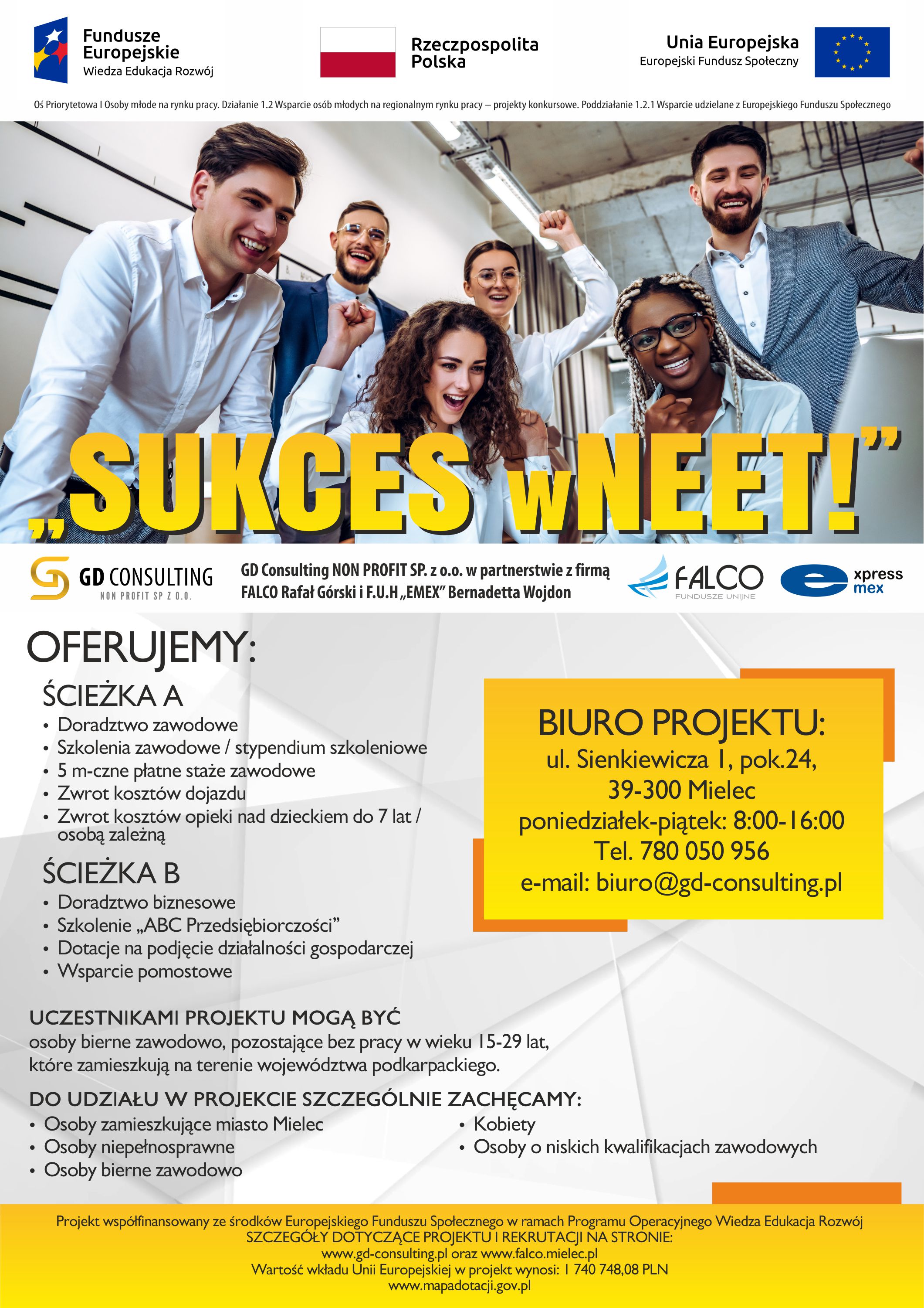 Uprzejmie informujemy, że firma GD Consulting NON PROFIT Sp. z o.o. zakończyła i rozliczyła realizację projektu „SUKCES wNEET!” współfinansowanego ze środków Europejskiego Funduszu Społecznego, Oś priorytetowa I Osoby młode na rynku pracy, Działanie 1.2 Wsparcie osób młodych na regionalnym rynku pracy - projekty konkursowe, Poddziałanie 1.2.1 Wsparcie udzielane z Europejskiego Funduszu Społecznego.